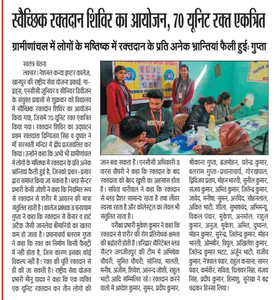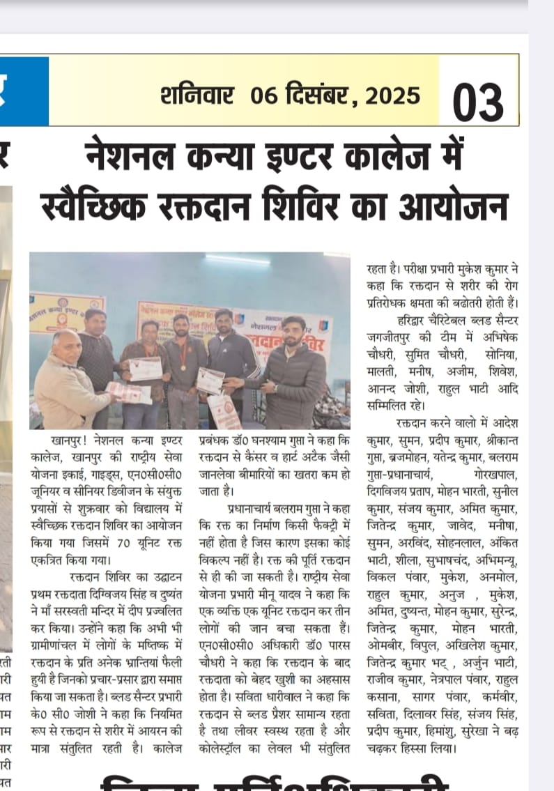 बालिका शिक्षा प्रोत्साहन कार्यक्रम के अंतर्गत बालिका दिवस के अवसर पर दिनांक 11 अक्टूबर 2025 को नेशनल कन्या इंटर कॉलेज खानपुर हरिद्वार की इंटरमीडिएट परीक्षा 2024 में ब्लॉक खानपुर में सर्वोच्च अंकों के साथ प्रथम स्थान प्राप्त करने पर ईशा सैनी को माननीय मुख्यमंत्री जी श्री पुष्कर सिंह धामी जी तथा बाल विकास विभाग की सम्मानित मंत्री श्रीमती रेखा आर्य जी द्वारा देहरादून में प्रशस्ति पत्र व सैमसंग का स्मार्टफोन देकर सम्मानित किया गयाl बालिका ईशा सैनी को बहुत-बहुत बधाई शुभकामनाएं आशीर्वादl वह निरंतर प्रगति के पथ पर अग्रसर होती रहे ऐसी परमपिता परमेश्वर से कामना करते हैं डॉक्टर घनश्याम गुप्ता प्रबंधक बलराम गुप्ता प्रधानाचार्य नेशनल कन्या इंटर कॉलेज खानपुर हरिद्वार |