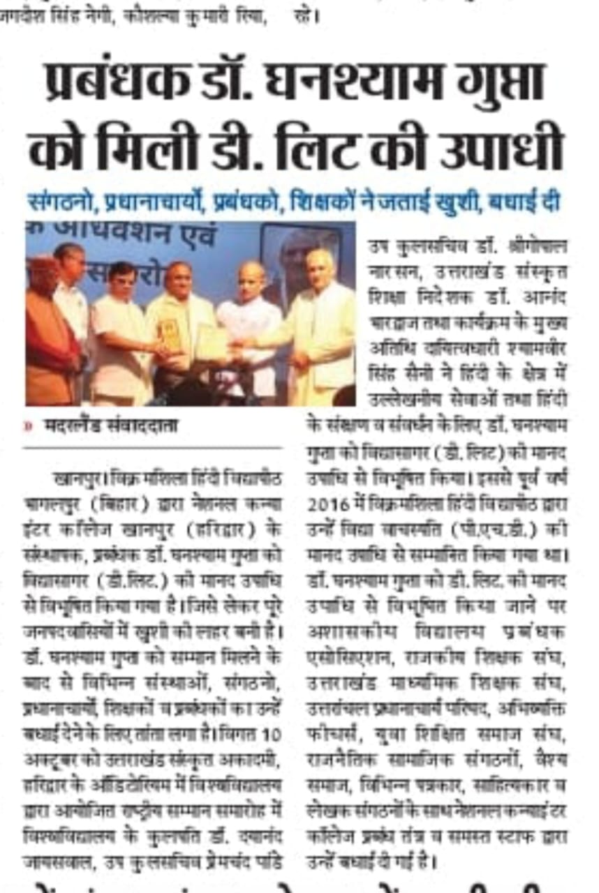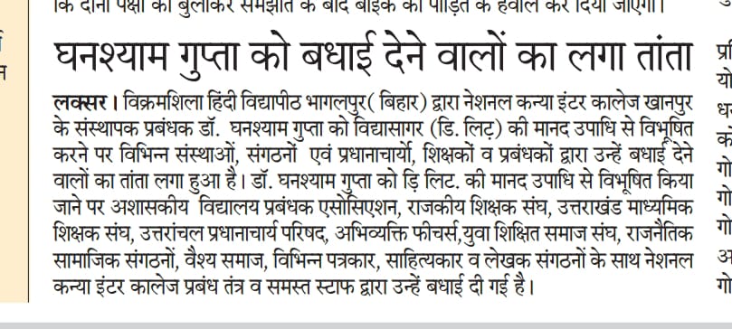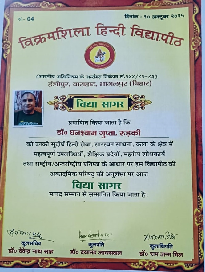 विक्रमशिला हिंदी विद्यापीठ भागलपुर बिहार द्वारा हिंदी के विकास, संरक्षण, संवर्धन हेतु किए गए उल्लेखनीय प्रयासों के फल स्वरुप विद्या वाचस्पति पीएचडी की मानद उपाधि के बाद आज दिनांक 10 अक्टूबर 2025 को संस्कृत अकादमी उत्तराखंड हरिद्वार के ऑडिटोरियम में विद्यासागर की मानद उपाधि से विभूषित होने का स्वर्णिम अवसर प्राप्त हुआ l उत्तराखंड सरकार के सम्मानित राज्य मंत्री श्री श्याम वीर सैनी जी उत्तराखंड संस्कृत शिक्षा निदेशक सम्मानित डॉक्टर आनंद भारद्वाज जी विक्रमशिला हिंदी विद्यापीठ के उप कुलसचिव सम्मानित डॉक्टर श्रीगोपाल नारसन जी विश्वविद्यालय के सम्मानित कुलपति महोदय सहित अनेक पदाधिकारियों द्वारा यह सम्मान मुझे प्रदान किया गया जिसके लिए मैं विश्वविद्यालय के समस्त पदाधिकारियों तथा माननीय मंत्री जी और सम्मानित संस्कृत शिक्षा निदेशक जी का हृदय से आभार व्यक्त करता हूं l डॉ घनश्याम गुप्ता पूर्व प्रधानाचार्य संस्थापक एवं प्रबंधक नेशनल कन्या इंटर कॉलेज खानपुर हरिद्वार|